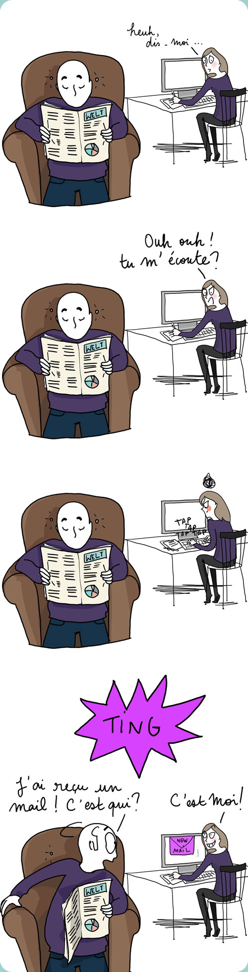 Moi je skype mon homme pour lui dire que le diner est pret quand il est au telephone! Ah… vie de couple modernes!!!!