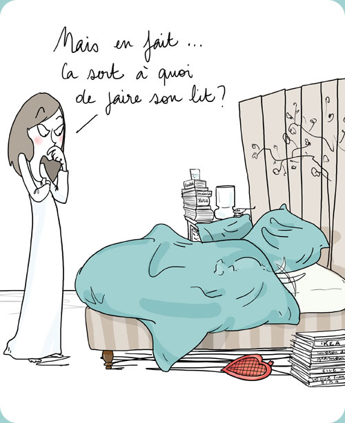 Moi, faire le lit, ça me sert a remettre la couverture à plat et den remettre de mon côté (le chéri, il me pique tout pendant la nuit!)