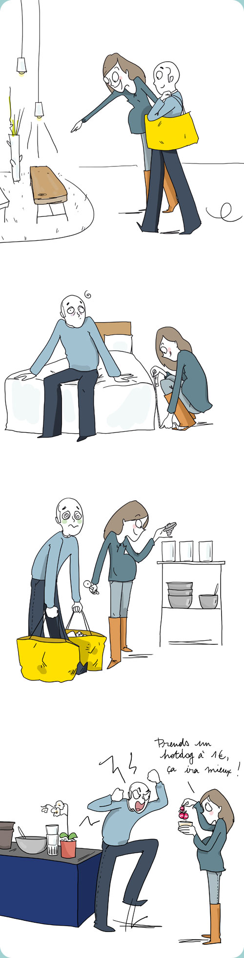 Wohnst du noch… oder lebst du schon?… les joies de IKEA en couple… et avec leur système, on est bien obligé de faire le tour de TOUT le magasin avant d’arriver à la sortie, une sorte de jeu de l’oie version moderne. Belle perspicacité et quel talent! Vivement ton livre!