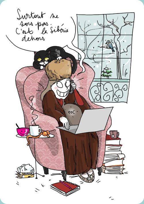 peux-tu me dire ce que c’est le petit serpent orange à côté de ta tasse de thé? Il a 2 yeux énormes, ça doit pas être un serpent… :o) En tout cas, restez (toi, « poc » et le chat) bien au chaud, il fait vraiment froid dehors!