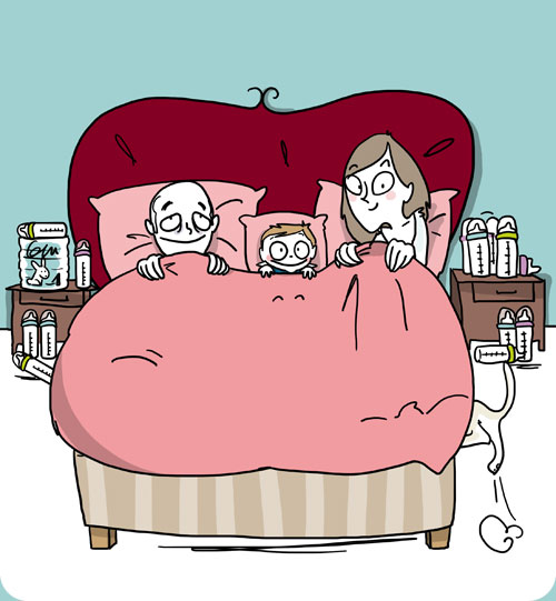 Cool tu es de retour, j’adore ton illustration. Mais dis donc on a l’impression que la Maman gère mieux son sommeil que le Papa. Un joli dessin de famille.
