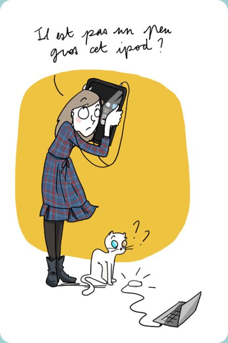 Très amusant et très réussi l’humour. Le fond jaune fait bien ressortir le relief du dessin et le contenu reflète bien la tendance en matière de technologie actuelle.