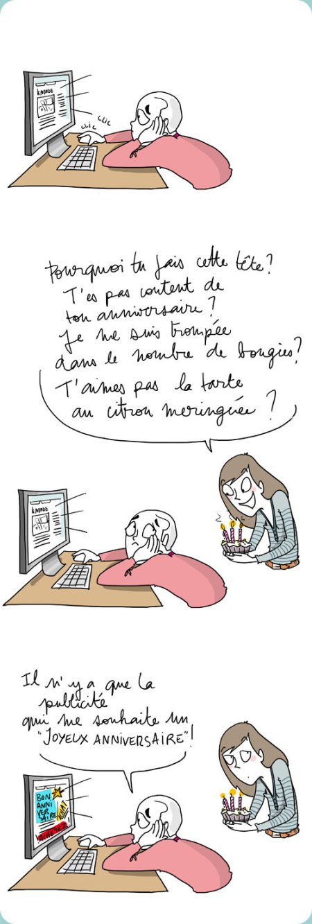 OOOH, moi aussi c’était mon anniversaire, et moi aussi ya que la pub, quasiment, qui me l’a souhaité! snif. Voilà ce que c’est de plus être sur facebook: les gens y sont tellement connectés qu’ils en ont besoin pour se souvenir de nos dates d’anniversaire!