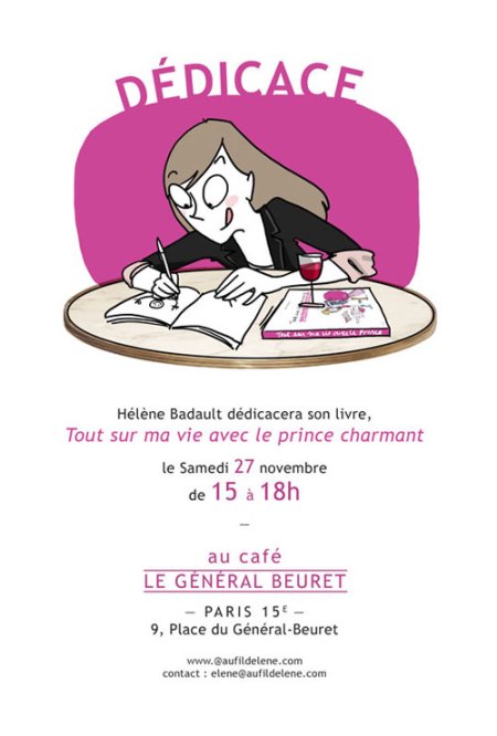 Une petite séance de dédicace de Tout sur ma vie avec le Prince Charmant (trouvable aussi à la FNAC) aura lieu dans mon repère du 15e : Le Général Beuret, le samedi 27 novembre 2010 de 15h à 18h.