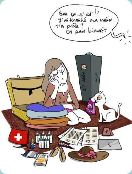 Bonnes vacances !! N’écrase pas ton chapeau dans ton sac, porte-le 🙂 Et les gants?? J’espère que tu n’as pas emballé bébé directement dans le lit pour gagner de la place :-)) /*je rigole */