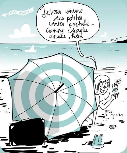 Bonnes vacances au blog aussi!! à la talentueuse fileuse 😉 – et à très vite pour de nouveaux dessins à la rentrée – avec la tête plein de souvenirs ensoleillés, d’apéros interminables et de pics nics à la campagne. Du sable entre les pages de nos bouquins, des chapeaux de paille un peu plus aplatis encore et des sandales usées jusqu’à la corde, mais avec des des tonnes d’envies, de nouveaux projets et de nouvelles histoires à écrire !!!